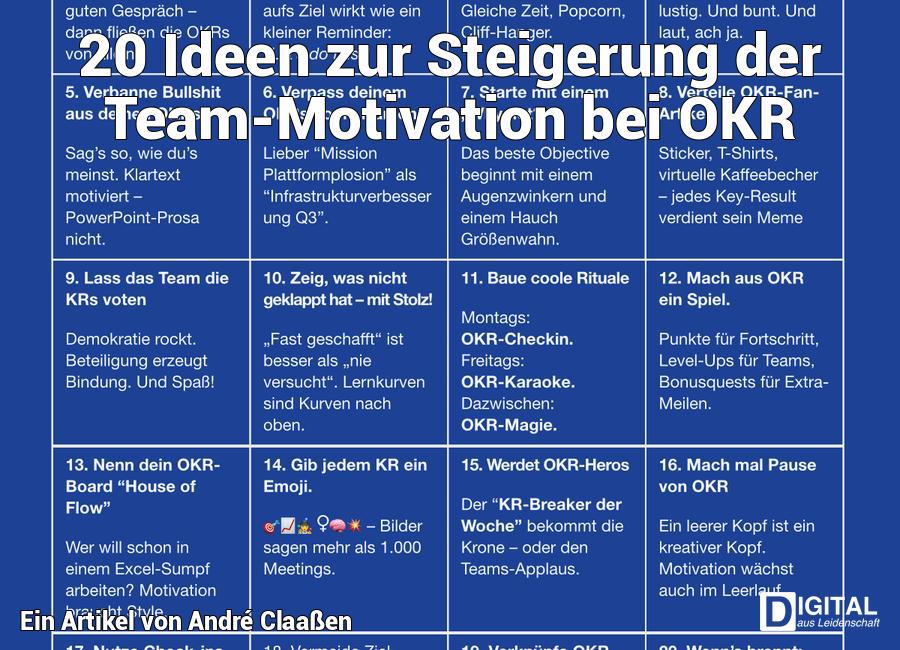 Lese weiterManchmal gibt es im Team Durchhänger mit OKR. Hier sind 20 Tipps für mehr Motivation und ein wenig Spaß mit OKR. Ich wünsche dir viel Spaß mit den Tipps. ...