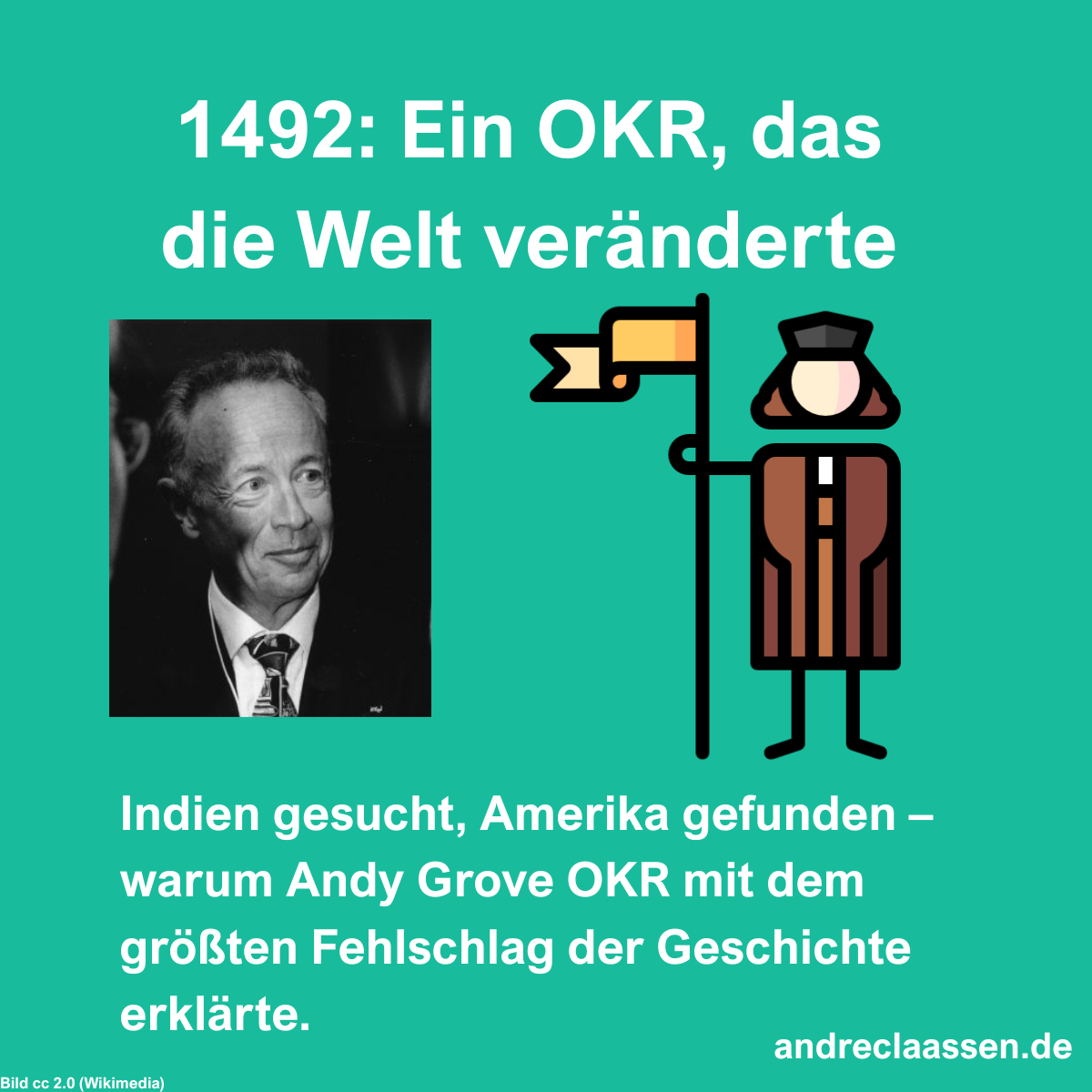 - Sein erstes Key Result: Drei seetüchtige Schiffe ausrüsten und bemannen. Die Santa María, die Pinta und die Niña. Solide Karavellen, die den Atlantik überstehen konnten.