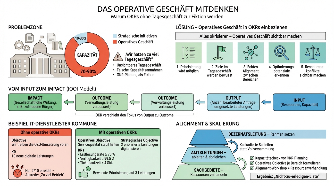 Ich höre diesen Satz in fast jeder Verwaltung, die OKRs einführt. Und er zeigt ein grundsätzliches Problem: Wenn das operative Geschäft nicht Teil des OKR-Prozesses ist, wird es zum blinden Fleck. Es bindet Kapazität, ohne dass jemand diese Kapazität benennt. Es frisst Zeit, ohne dass diese Zeit in der Planung auftaucht. Und am Ende dient es als Erklärung für alles, was nicht geklappt hat.